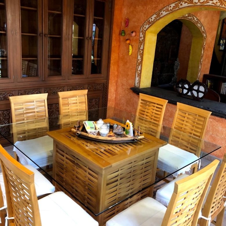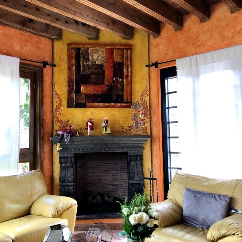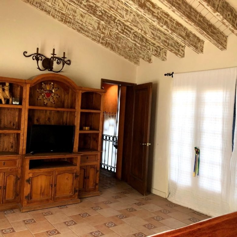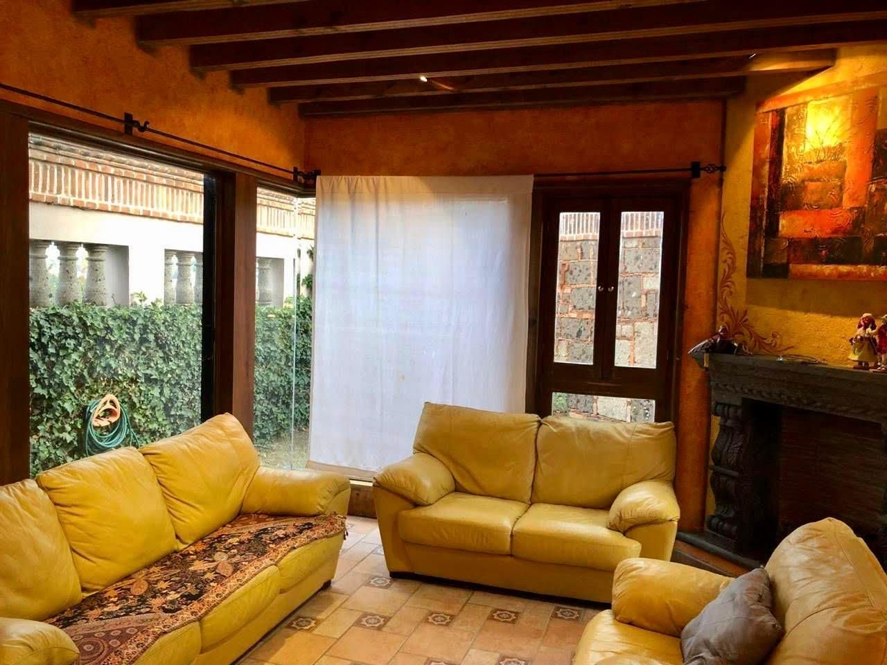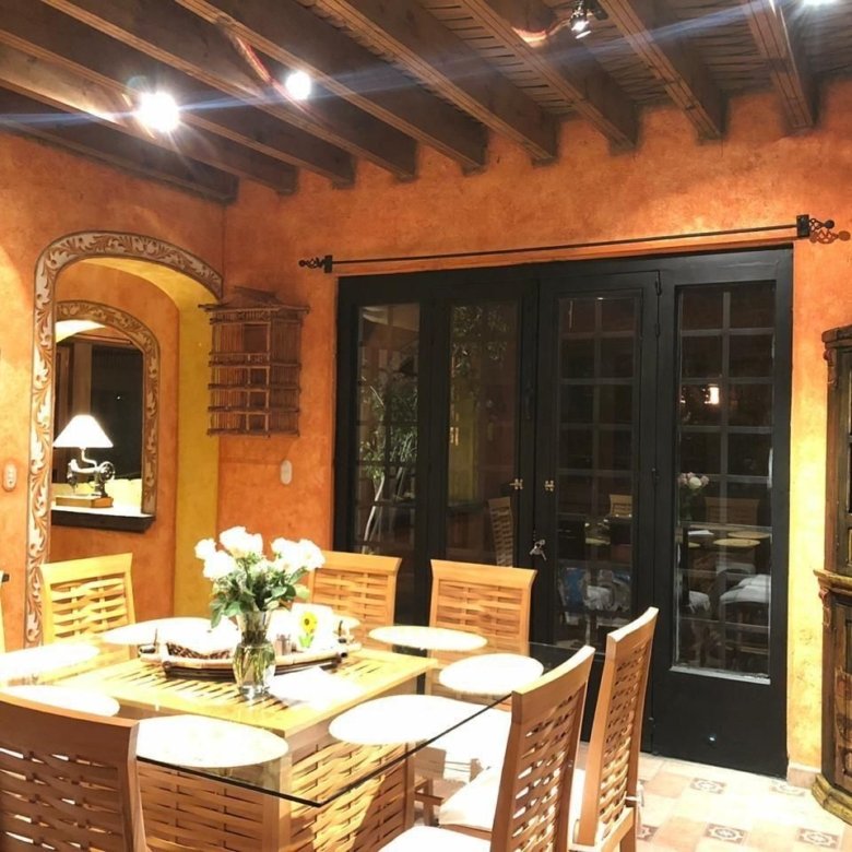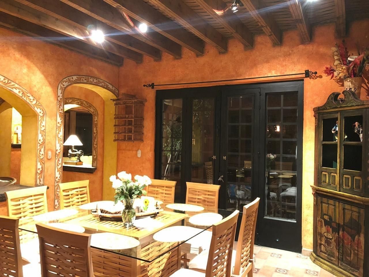 La puerta de entrada de madera tallada da paso a un acogedor vestíbulo que conduce a la sala de estar, la cual cuenta con una chimenea de piedra, vigas de madera y grandes ventanales con vista al jardín y al patio con fuente. El comedor y la cocina con barra desayunadora hacen de la planta baja un espacio ideal para reuniones.