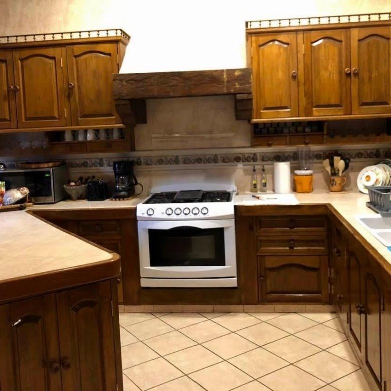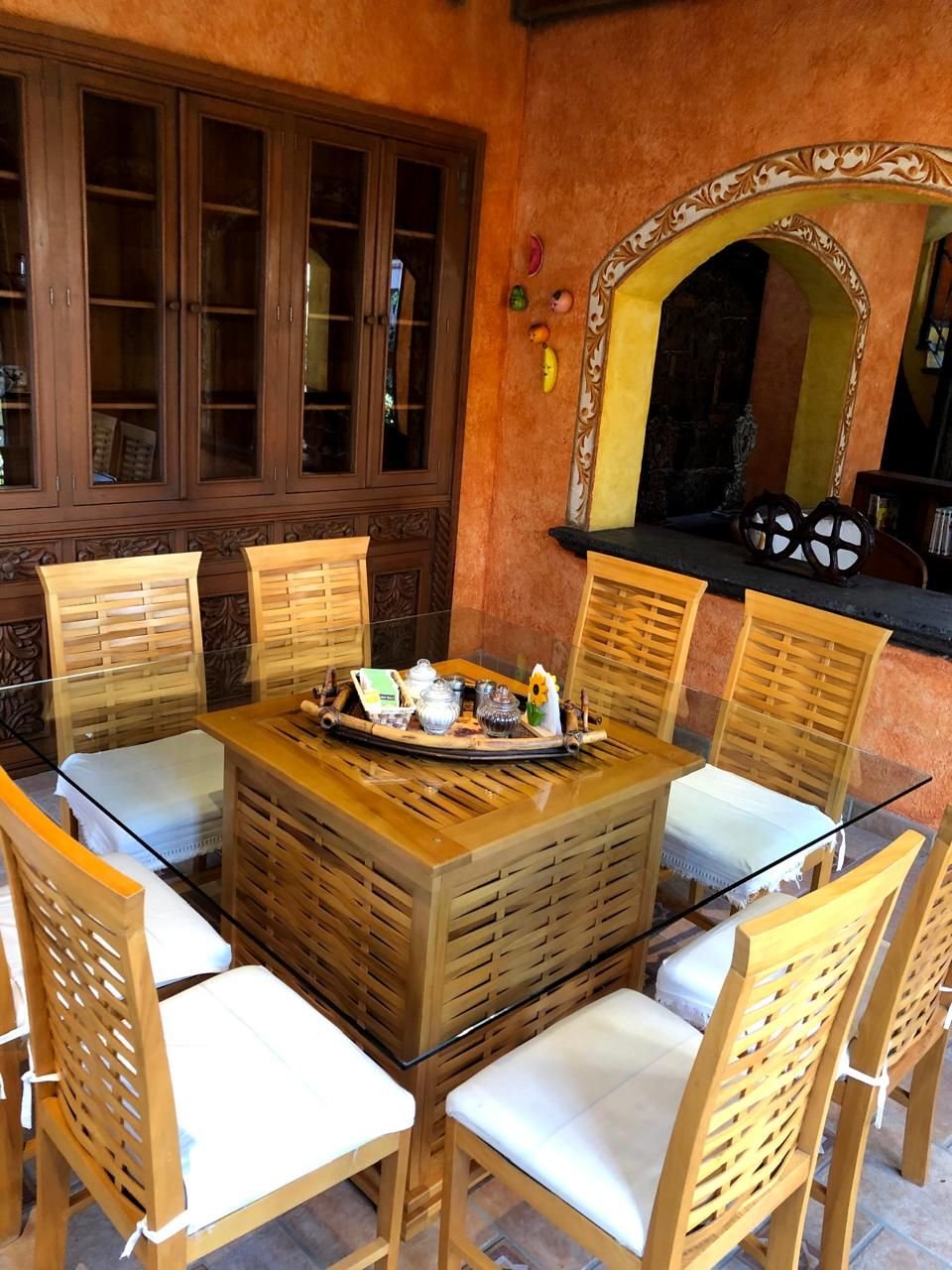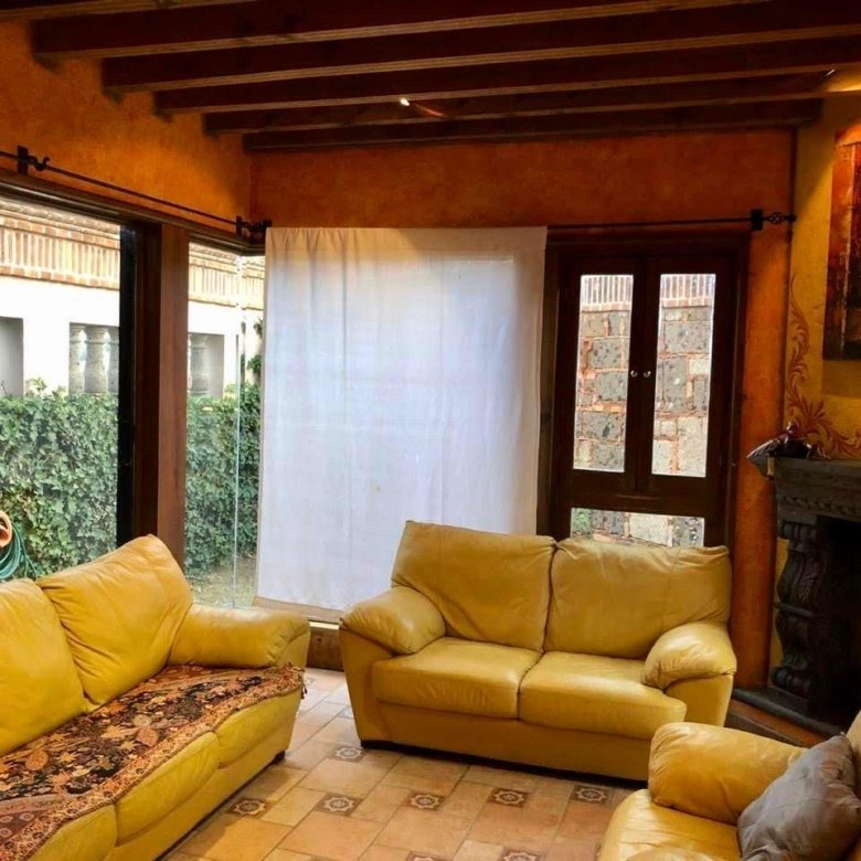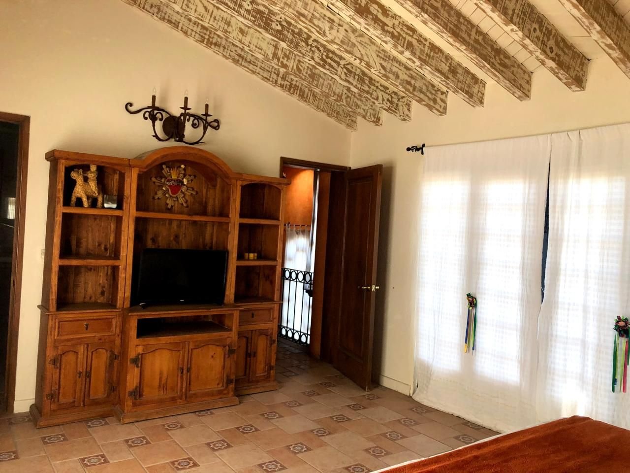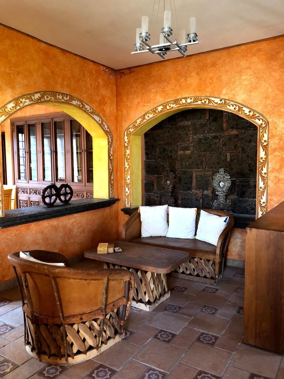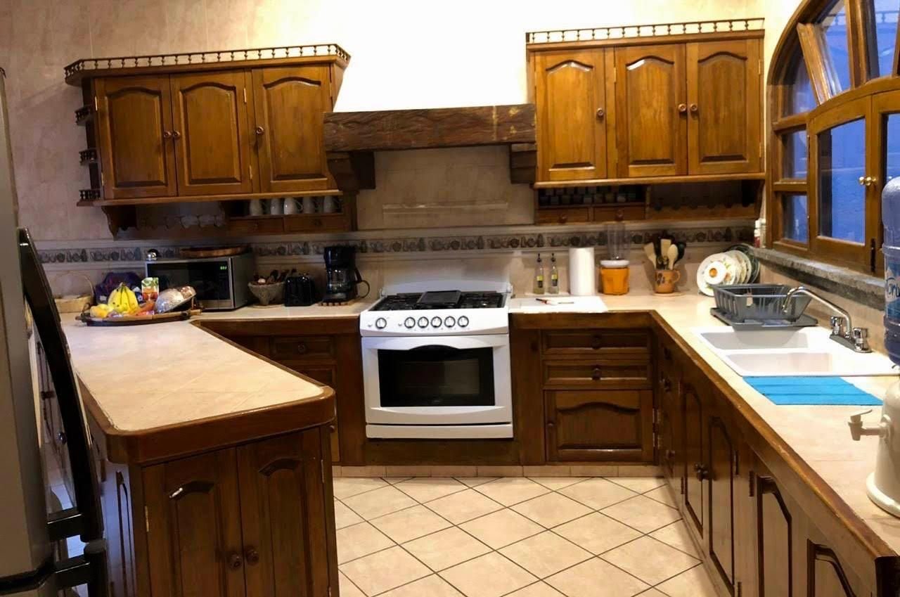 La puerta de entrada de madera tallada da paso a un acogedor vestíbulo que conduce a la sala de estar, la cual cuenta con una chimenea de piedra, vigas de madera y grandes ventanales con vista al jardín y al patio con fuente. El comedor y la cocina con barra desayunadora hacen de la planta baja un espacio ideal para reuniones.